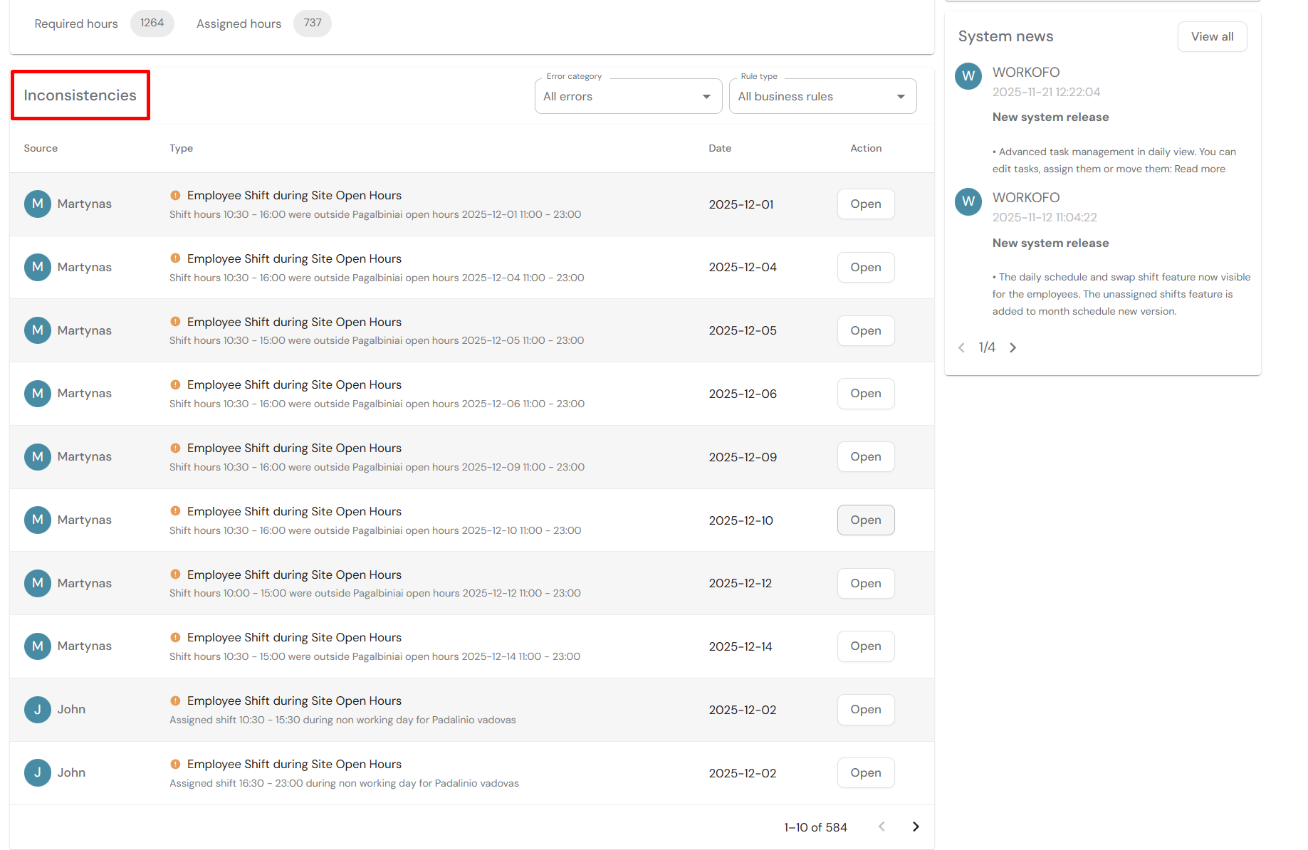 In the main system page, amongst other useful information, you can view all schedule inconsistencies, filter them and navigate to selected error.