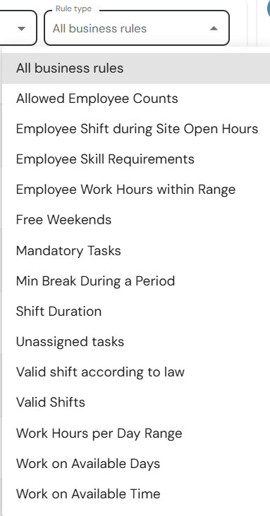 In the business rule menu select the desired category. The amount of business rules available for selection can be different based on present employee schedule planing errors.