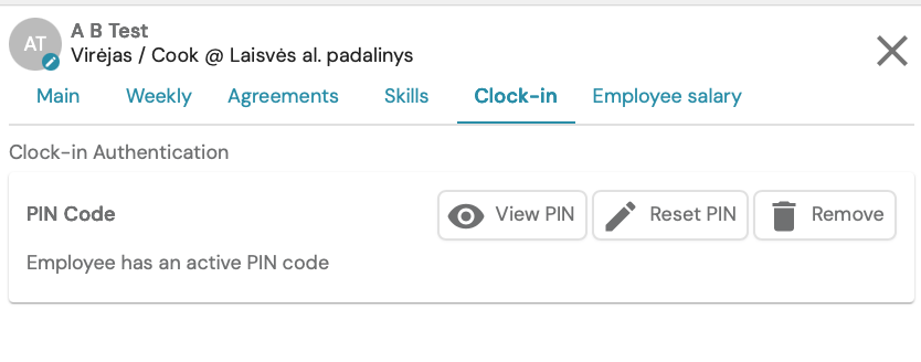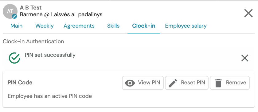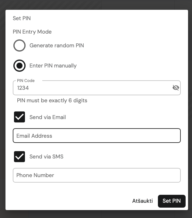 You can create your own code or choose to have the system generate a random one. (The length of the code is determined by agreement with the client). Also choose how you would like to inform the employee about the created PIN code - by email and/or SMS message.