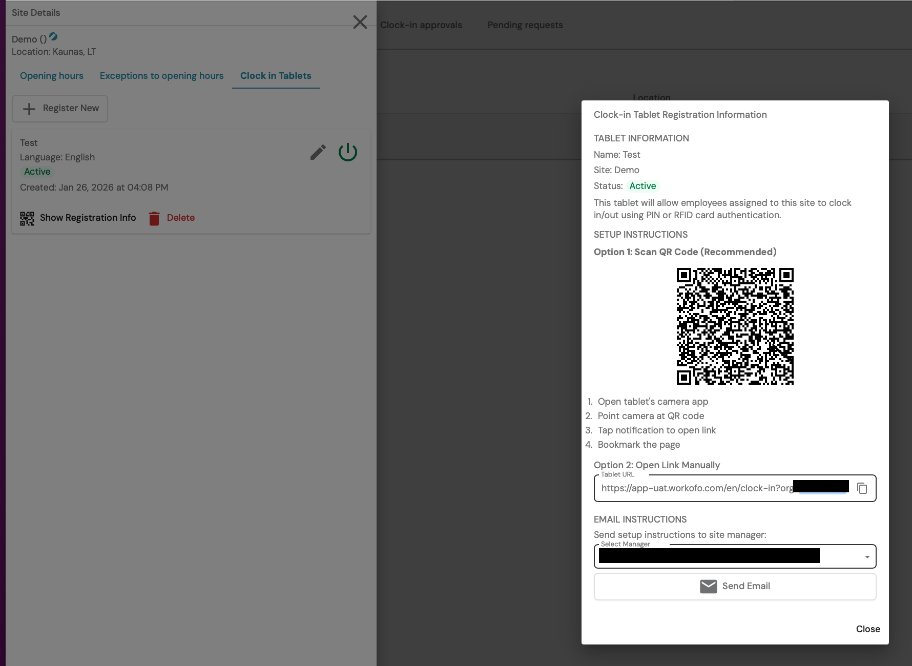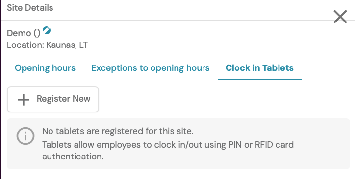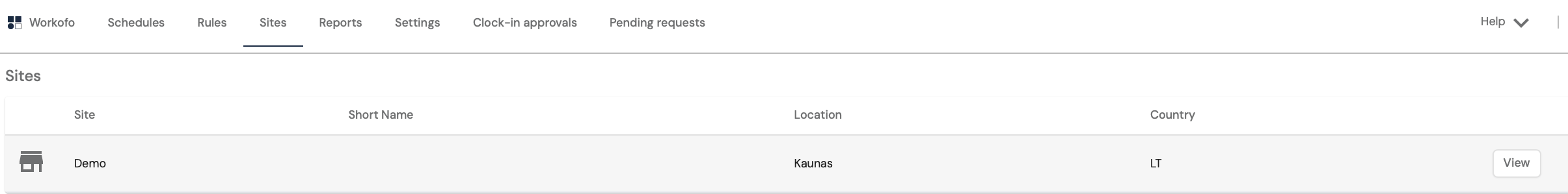 Clock in / Clock out is an employee time recording system that allows you to accurately track when employees start and finish work in the office. This function can be performed via a mobile application or tablet. You can place the tablet in a place accessible to employees so that they can mark their status when they arrive at and leave the workplace. A personal PIN code is used for registration. Managers should first register the tablet through which this functionality will be used. This can be done by opening the Sites menu section and clicking View next to the desired point.