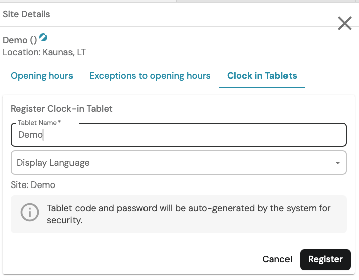 Create a name and select a display language, this is the language in which information will be displayed to employees who will use the tablet. Once everything is entered, click Register.