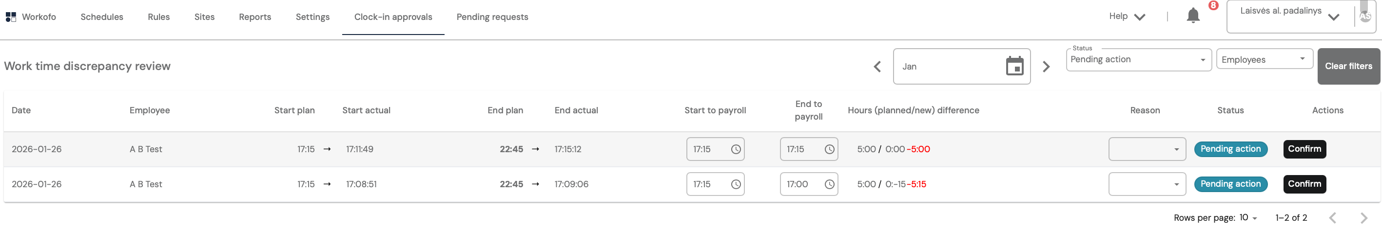The Clock - in approvals menu item shows shift discrepancies, i.e. if an employee clocked in earlier/later. Then the manager must approve the shift so that it is assigned to the employee. Before approval, it is possible to adjust the start and end of the shift, which will be indicated in the payroll report and schedule. Also, select the reason why it differs from the original, planned shift. (The list of reasons is created according to the client's needs).