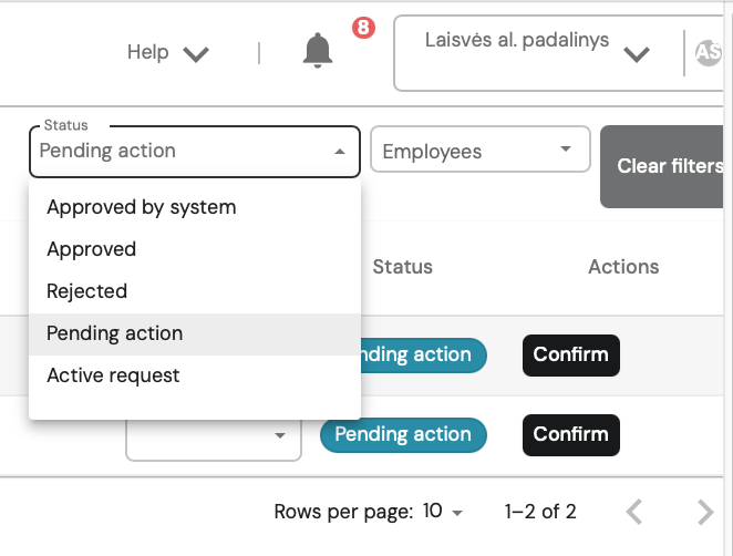 Working time discrepancies have a status, and can be filtered by Status or Employees.