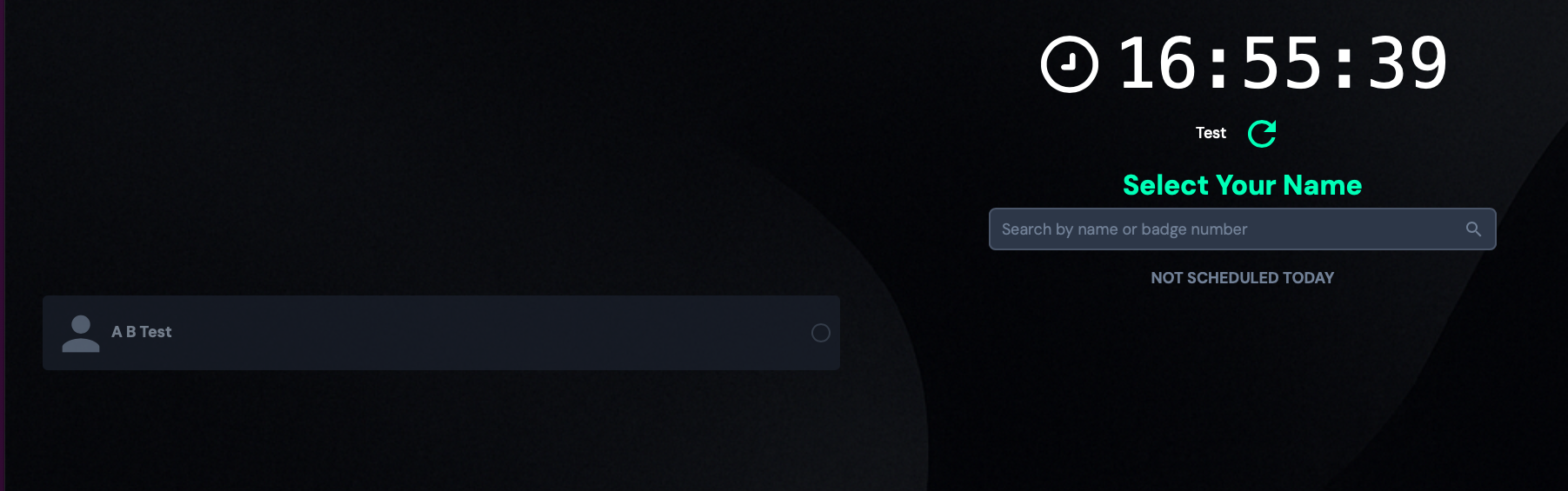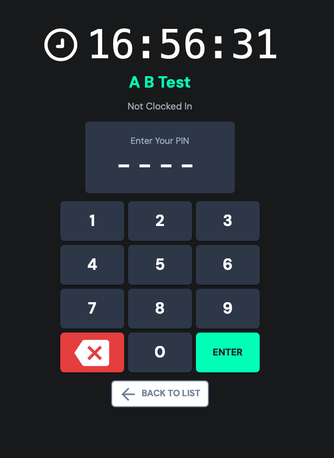 When leaving work, the sign-out procedure is the same as when checking in, select your name on the screen, enter your PIN code and press Clock out