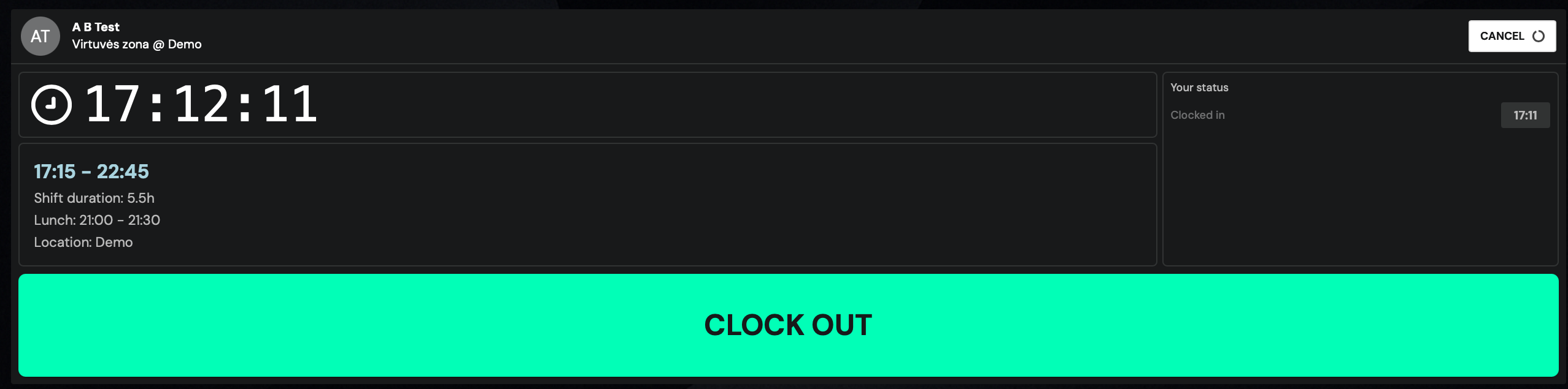 After entering your PIN, we will see the shift information you are working in today in the window. Click Clock In